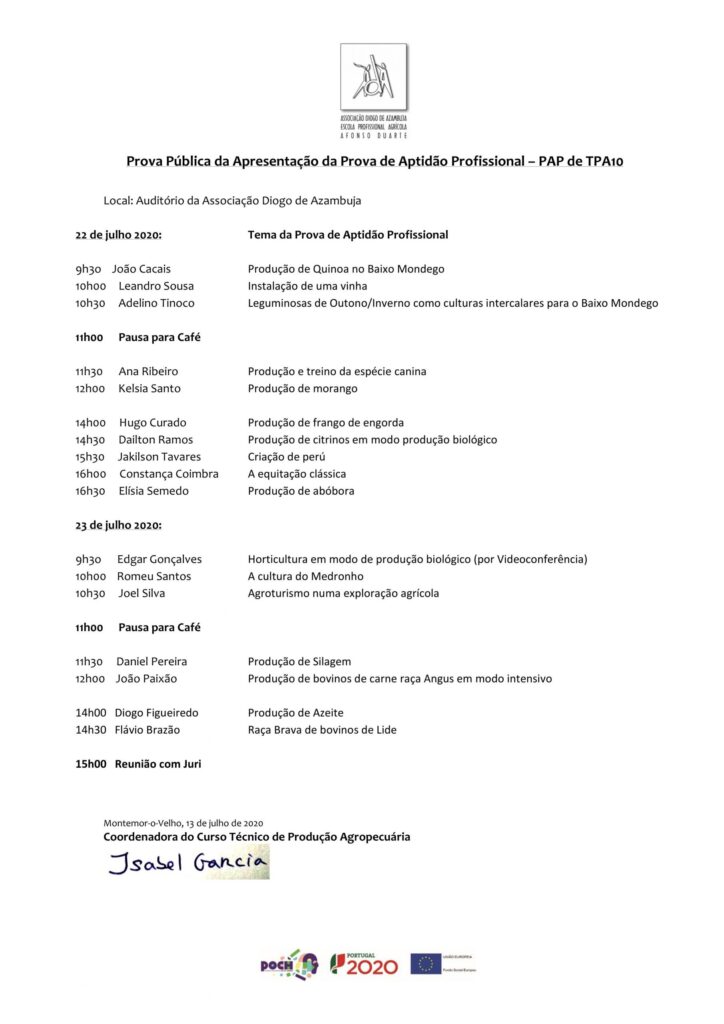 Os alunos do curso Técnico de Produção Agropecuária vão fazer a apresentação das Provas de Aptidão Profissional nos dias 22 e 23 de julho no auditório da Associação Diogo de Azambuja.